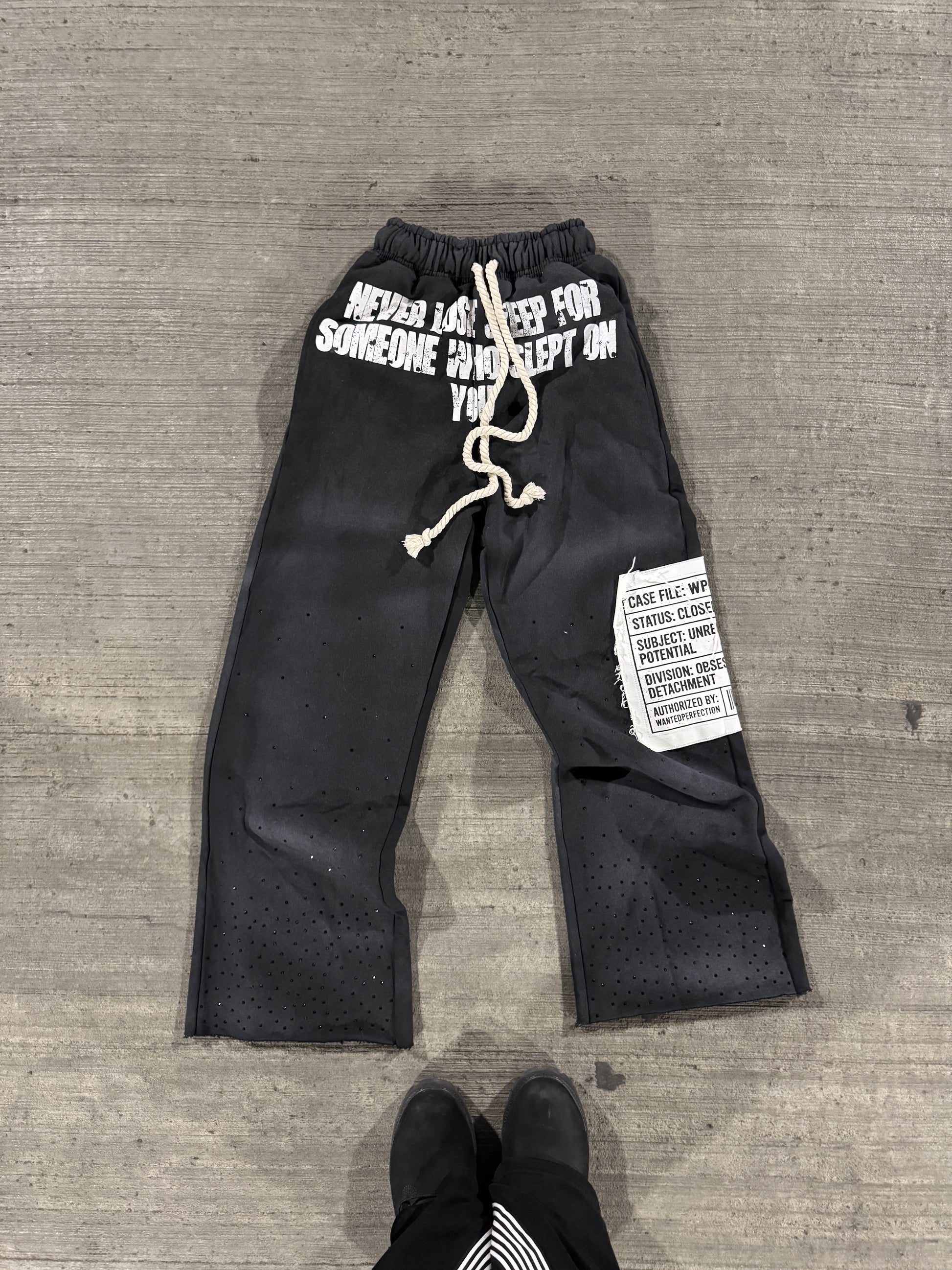 350 GSM 100% cotton sweats, rope strings, patch work, rhinestones, screenprint.